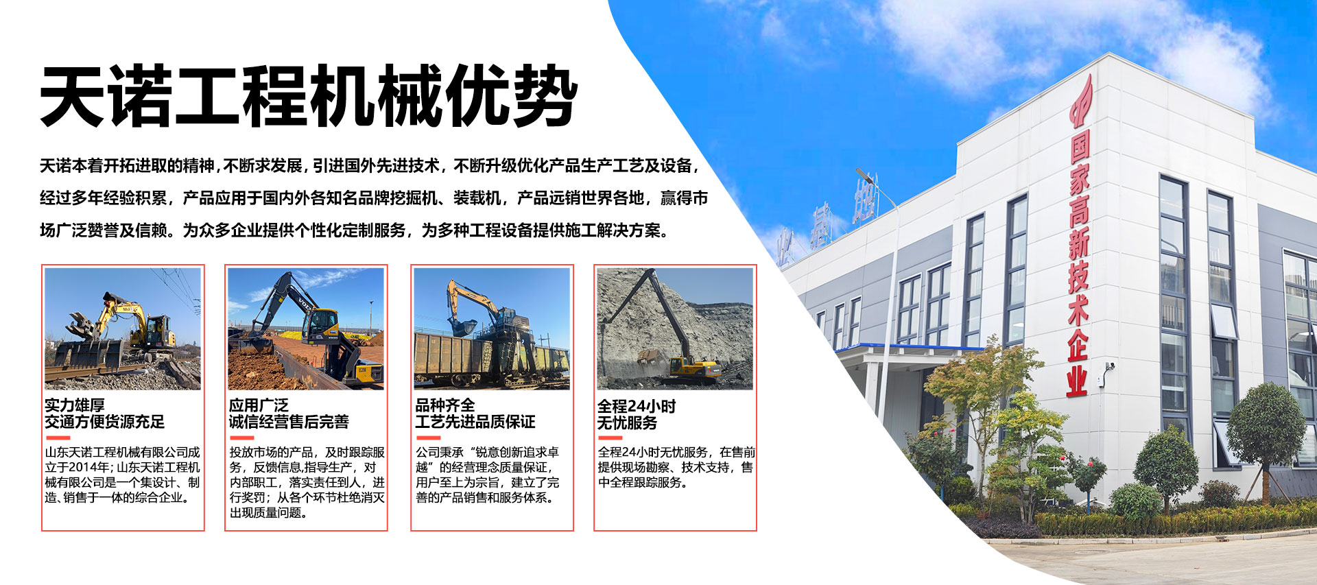 山東天諾工程機械有限公司成立于2014年;天諾工程機械是一個集設(shè)計、制造、銷售于一體的綜合企業(yè),生產(chǎn)產(chǎn)品適配各種工程機械設(shè)備,主要有:鐵路換枕機改裝,挖掘機升高底盤,挖掘機駕駛室升降,加長臂、三節(jié)臂、打樁臂、巖石臂定制,多型號挖斗鏟斗定制,裝載機防滑履帶,多種類鐵路維護屬具等產(chǎn)品。